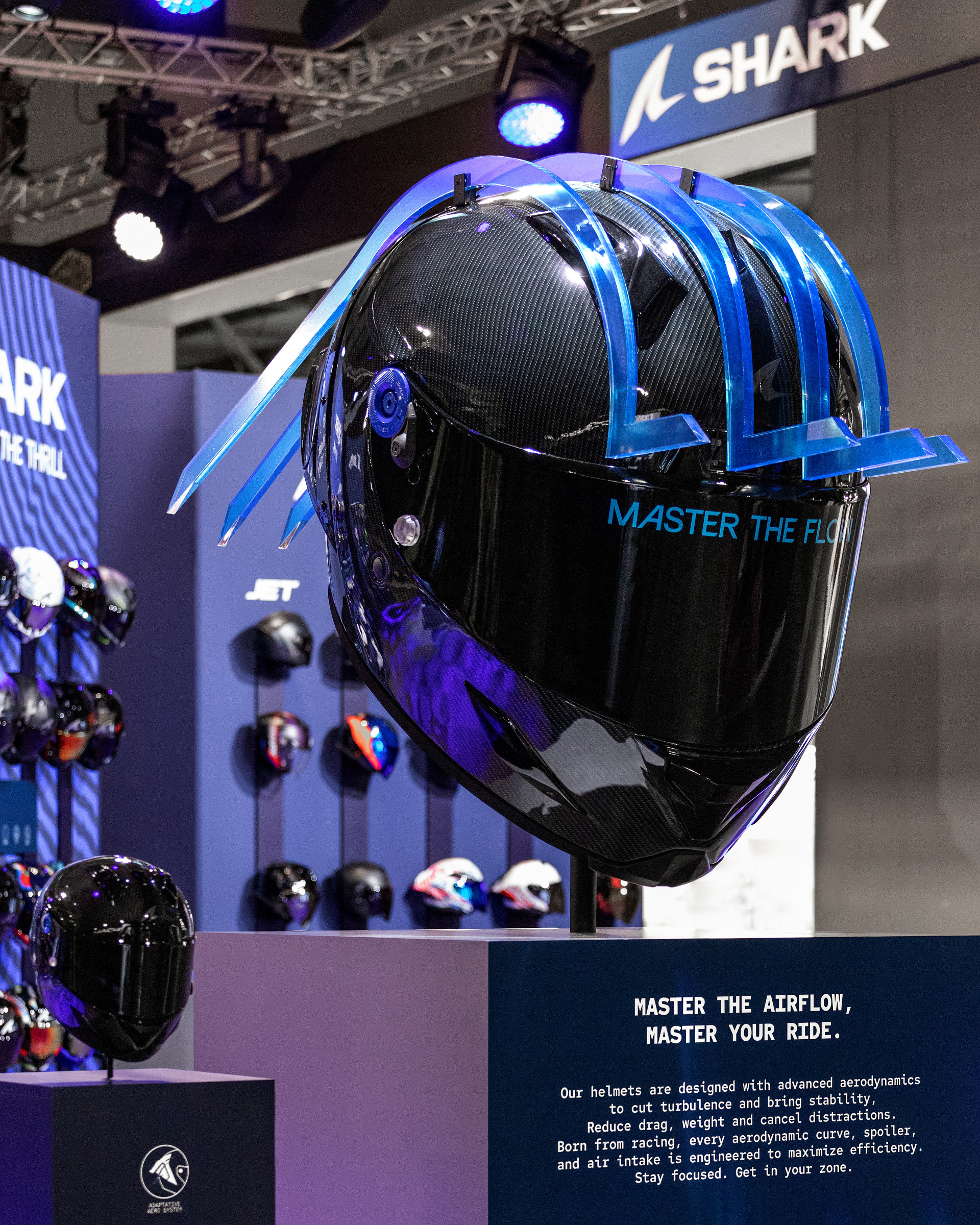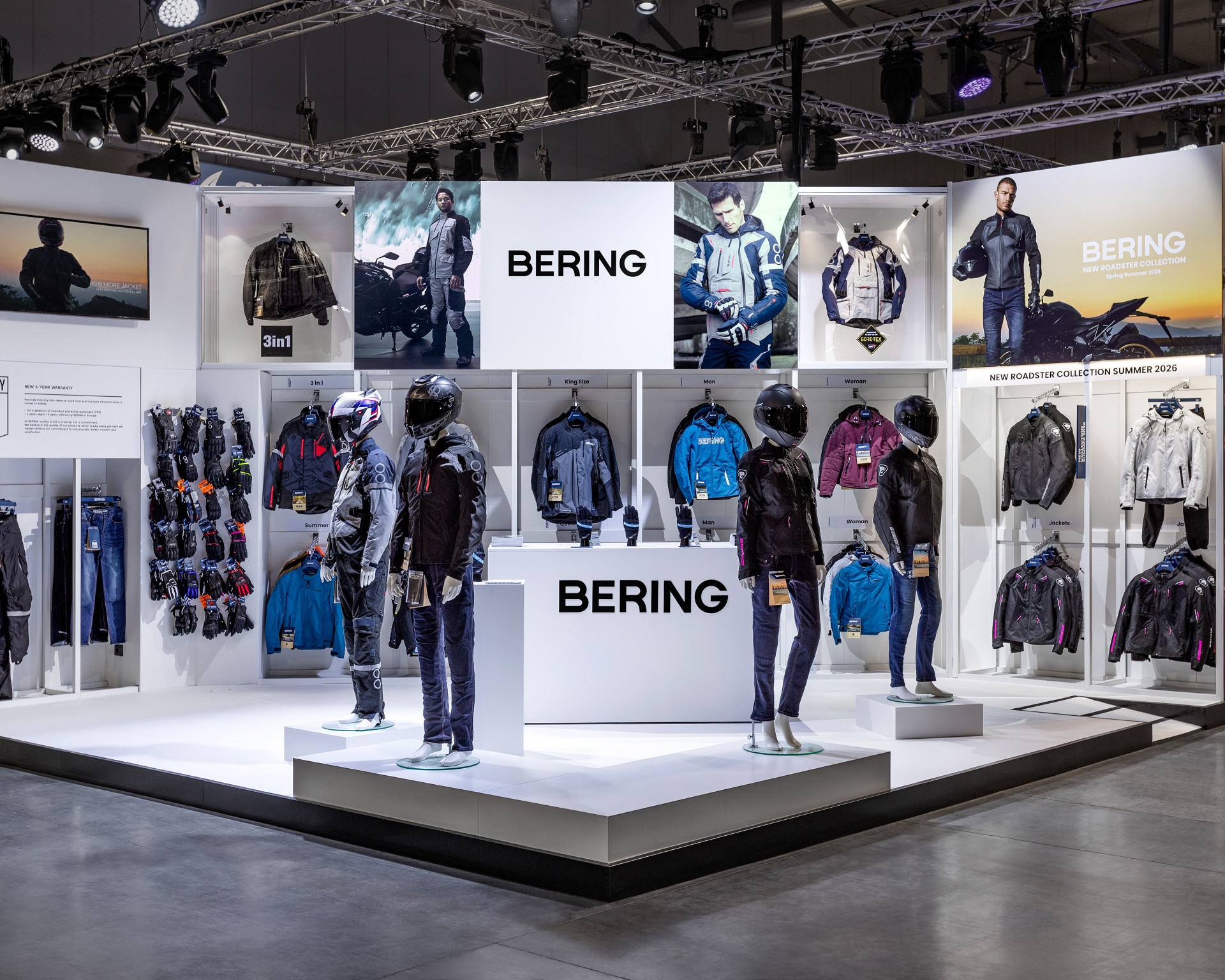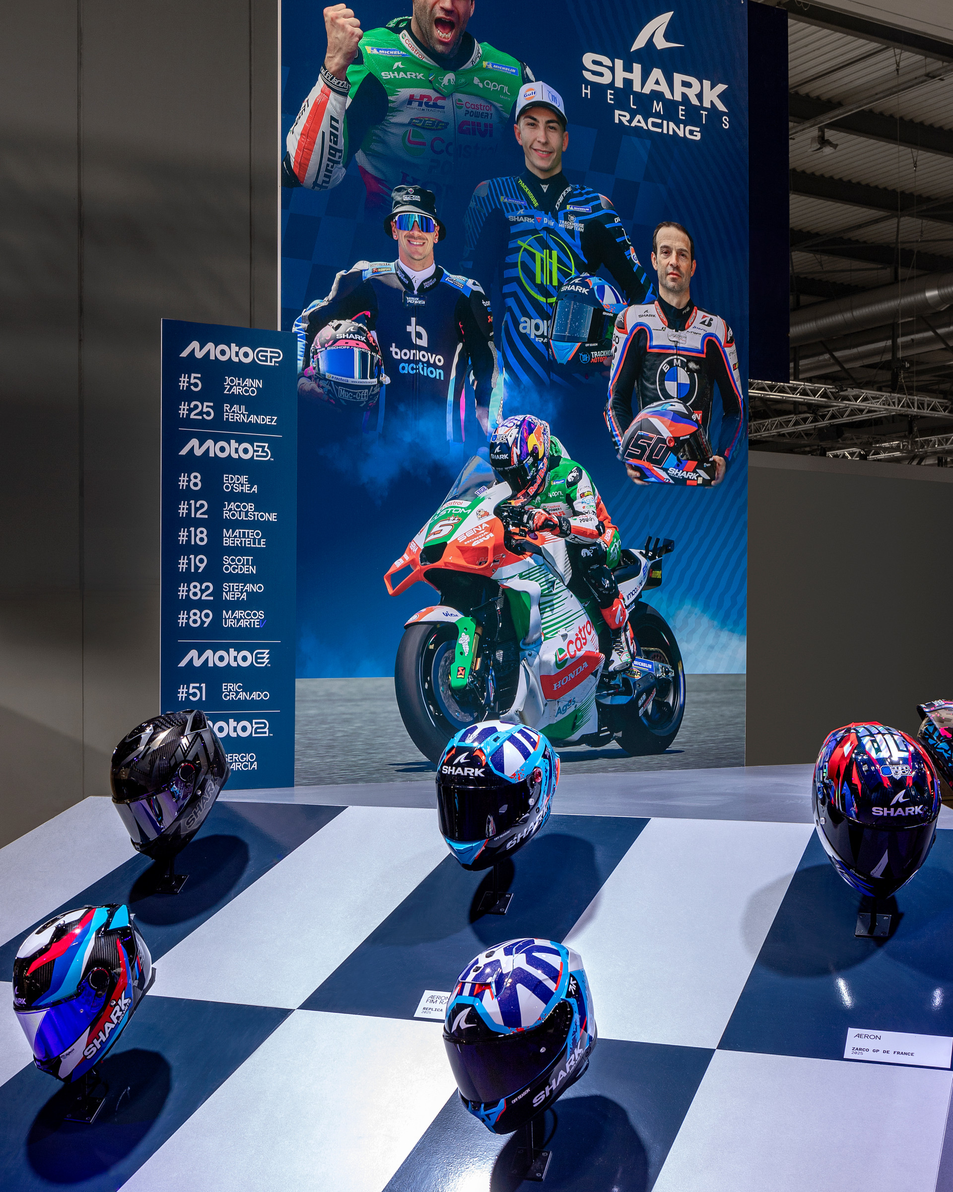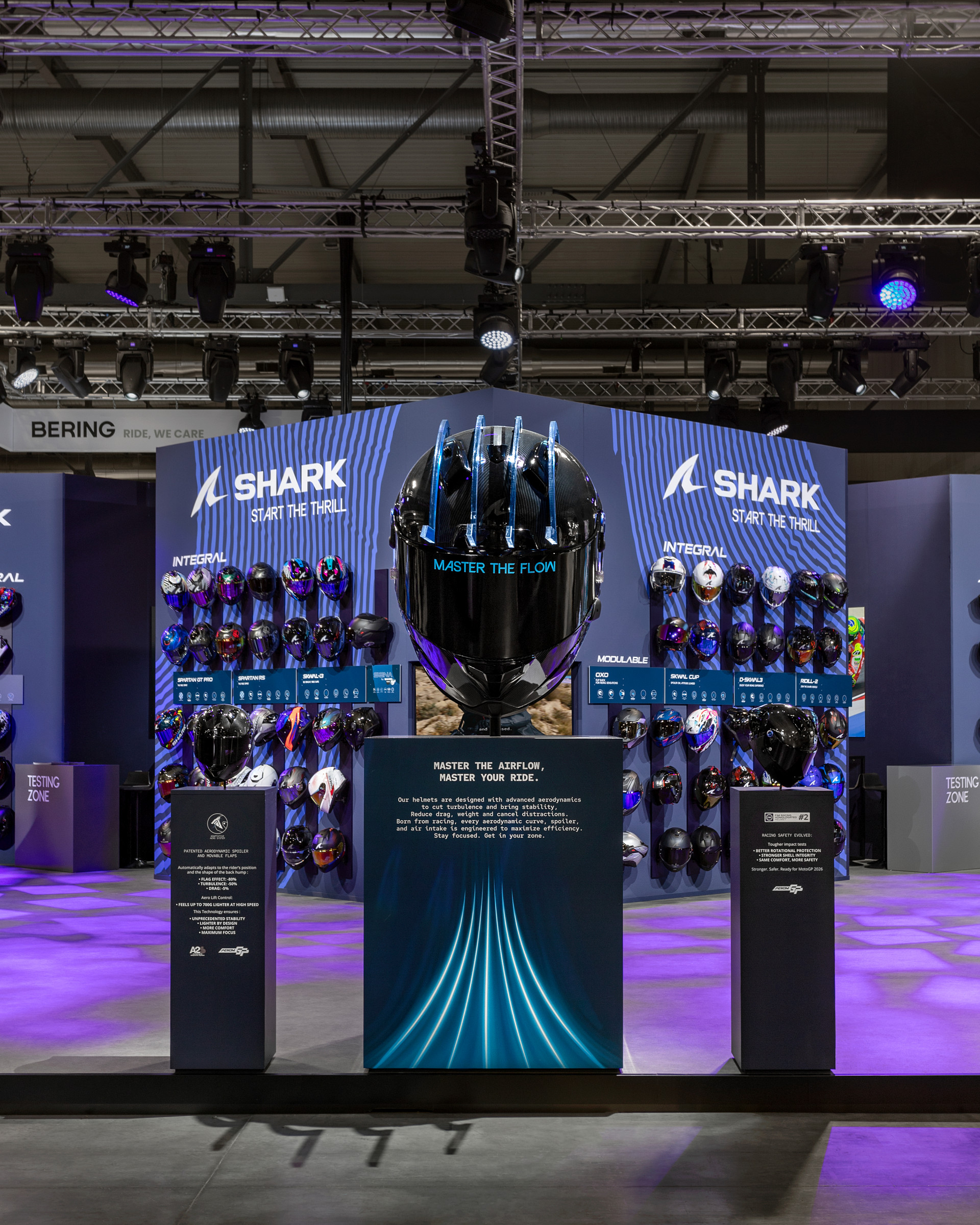 Nous avons eu le plaisir de concevoir et produire un stand de 275 m² pour le salon EICMA à Milan, pensé comme une immersion totale au cœur de trois marques majeures de l’univers moto : Shark, Bering et Segura.
