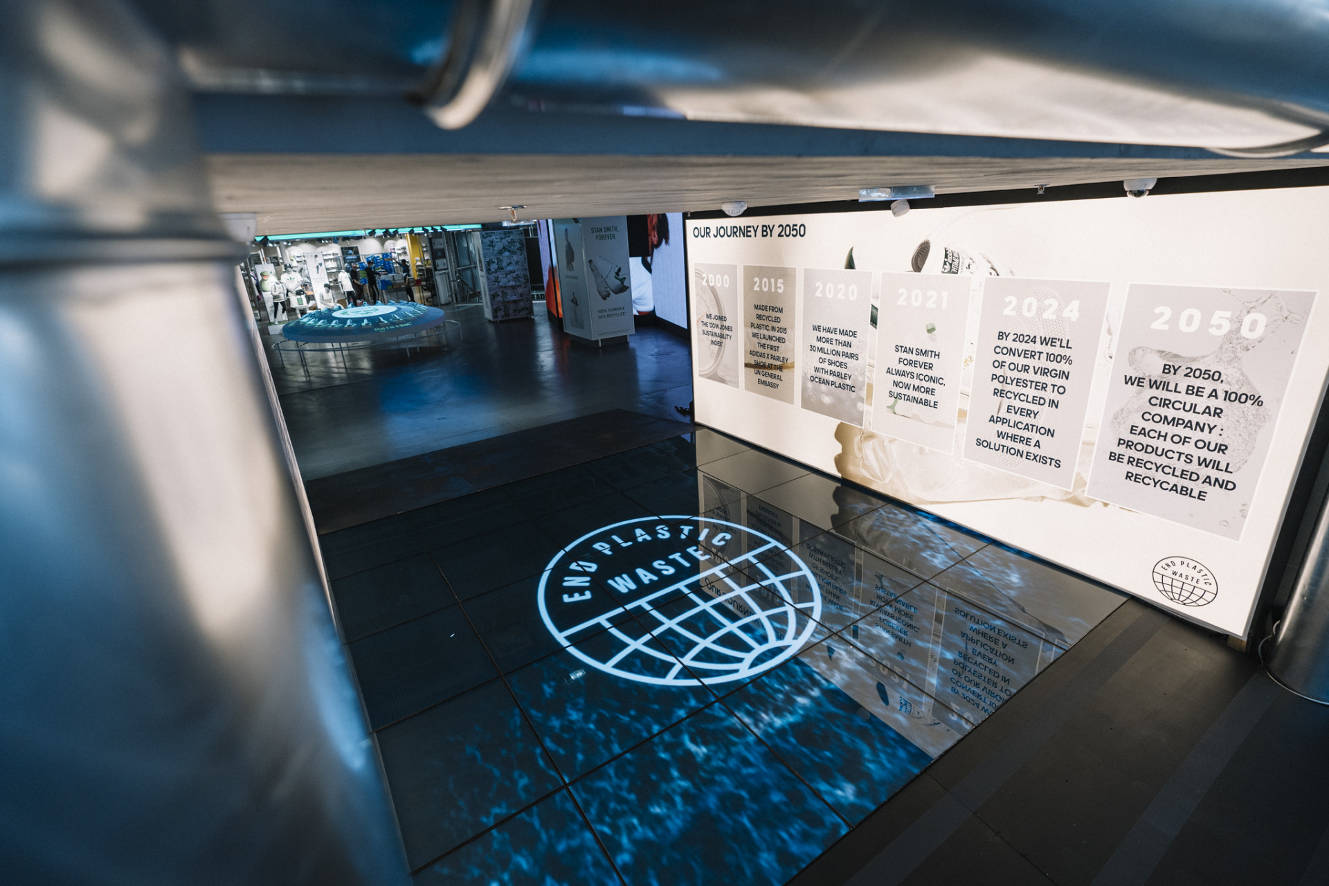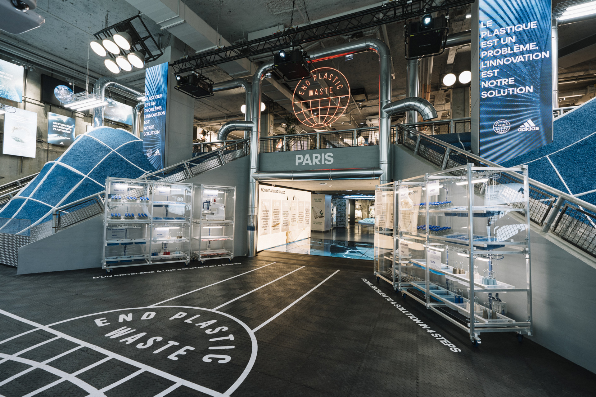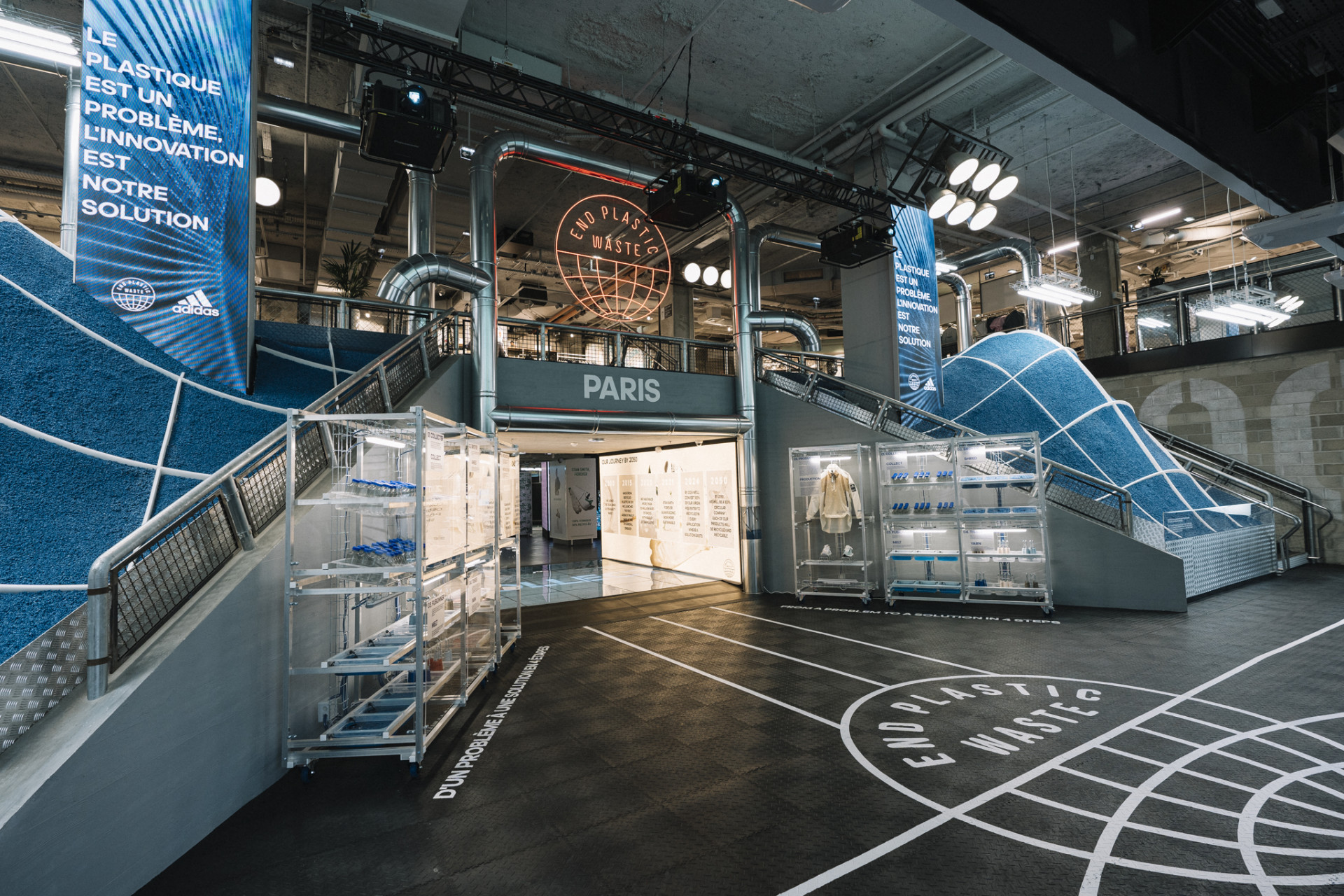 Dans le cadre de la campagne « End Plastic Waste », adidas fait appel à togaether pour concevoir une scénographie impactante sur ce thème. L’entrée du magasin est repensée comme une fabrique de plastique recyclé. Le visiteur se retrouve projeté au coeur du processus de fabrication, de la matière brute au produit final.