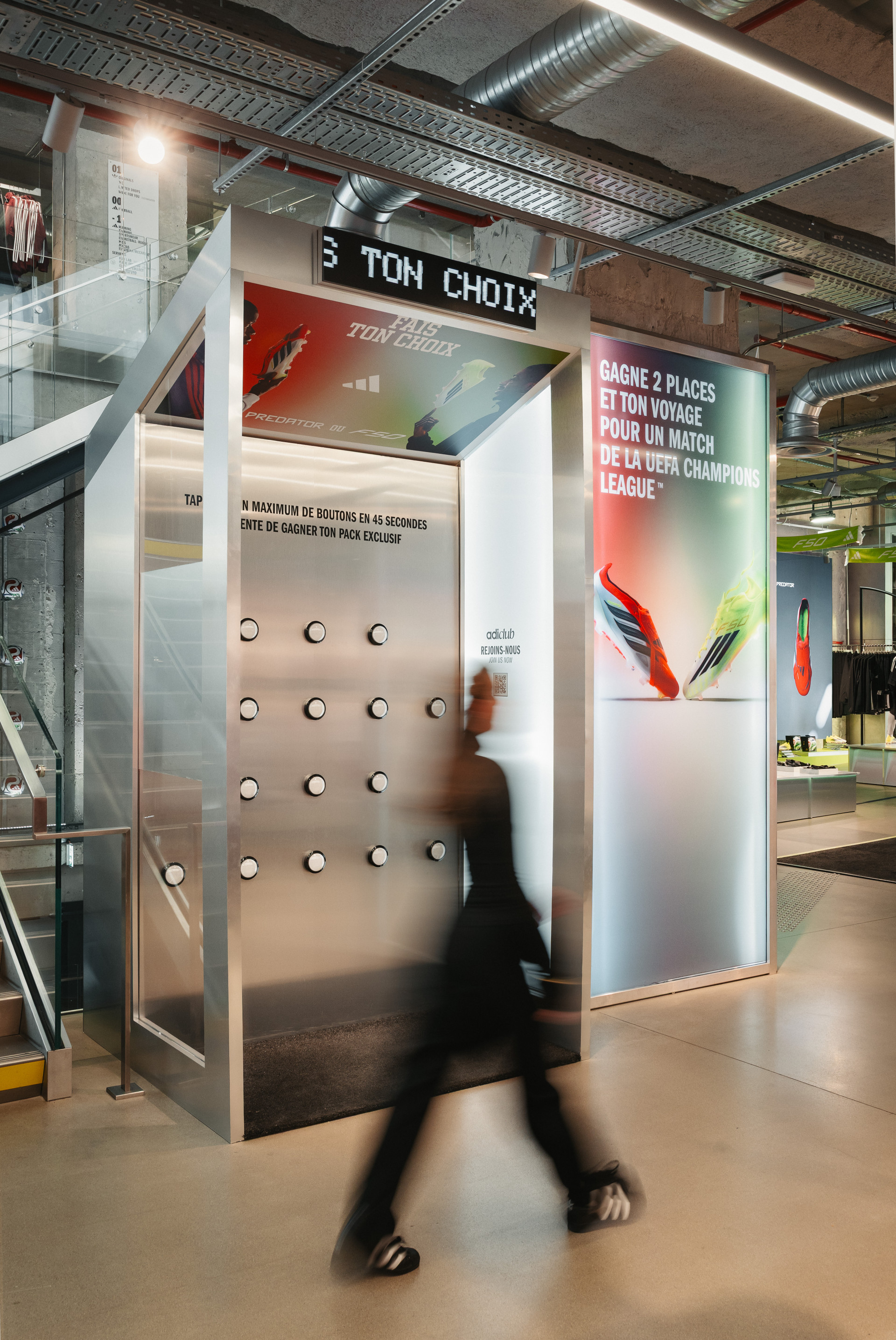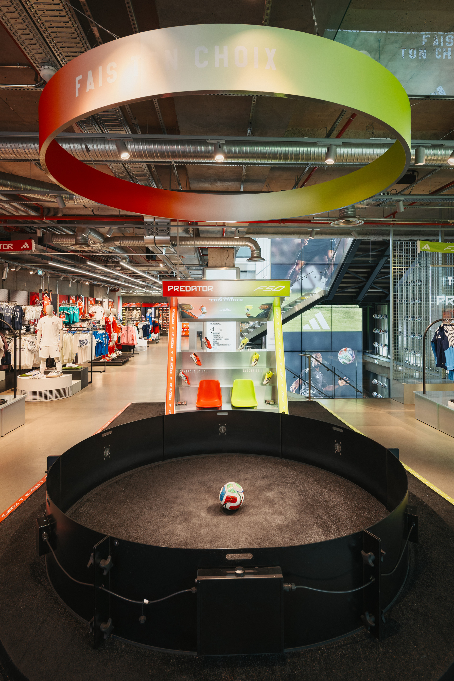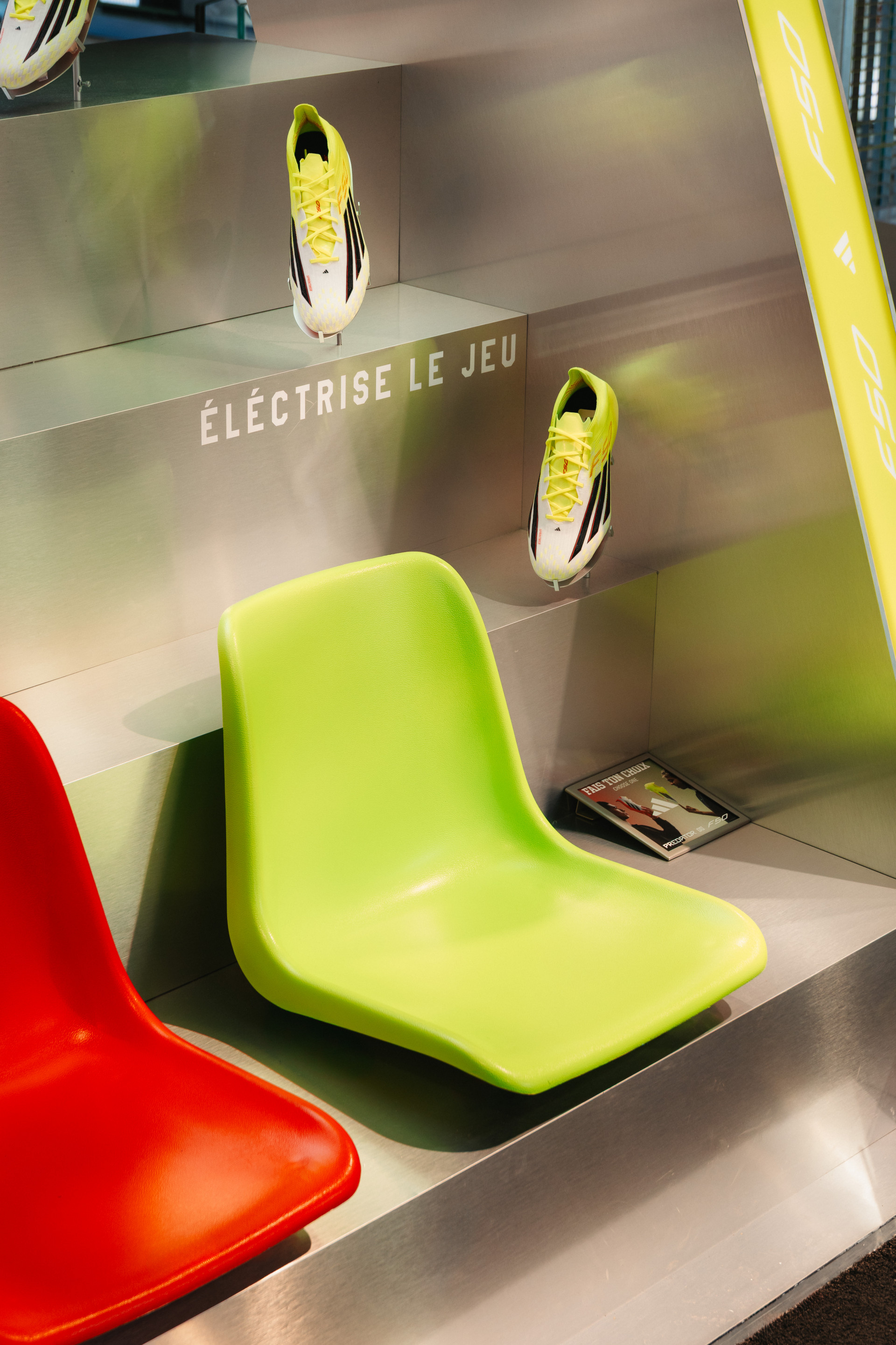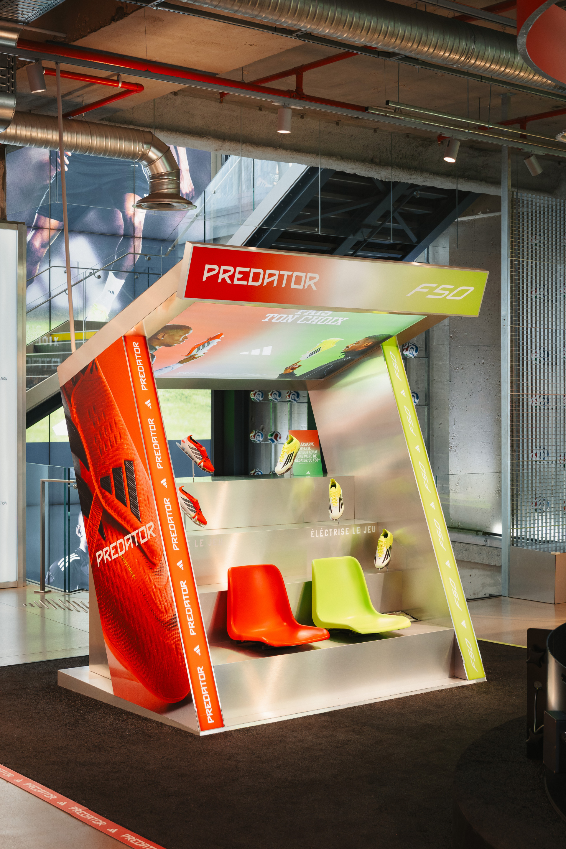 Dès l’entrée du magasin, un dispositif central structure l’espace et affirme cette opposition : l’univers rouge de la Predator, et l’univers jaune de la F50. Deux énergies et deux visions du jeu.
