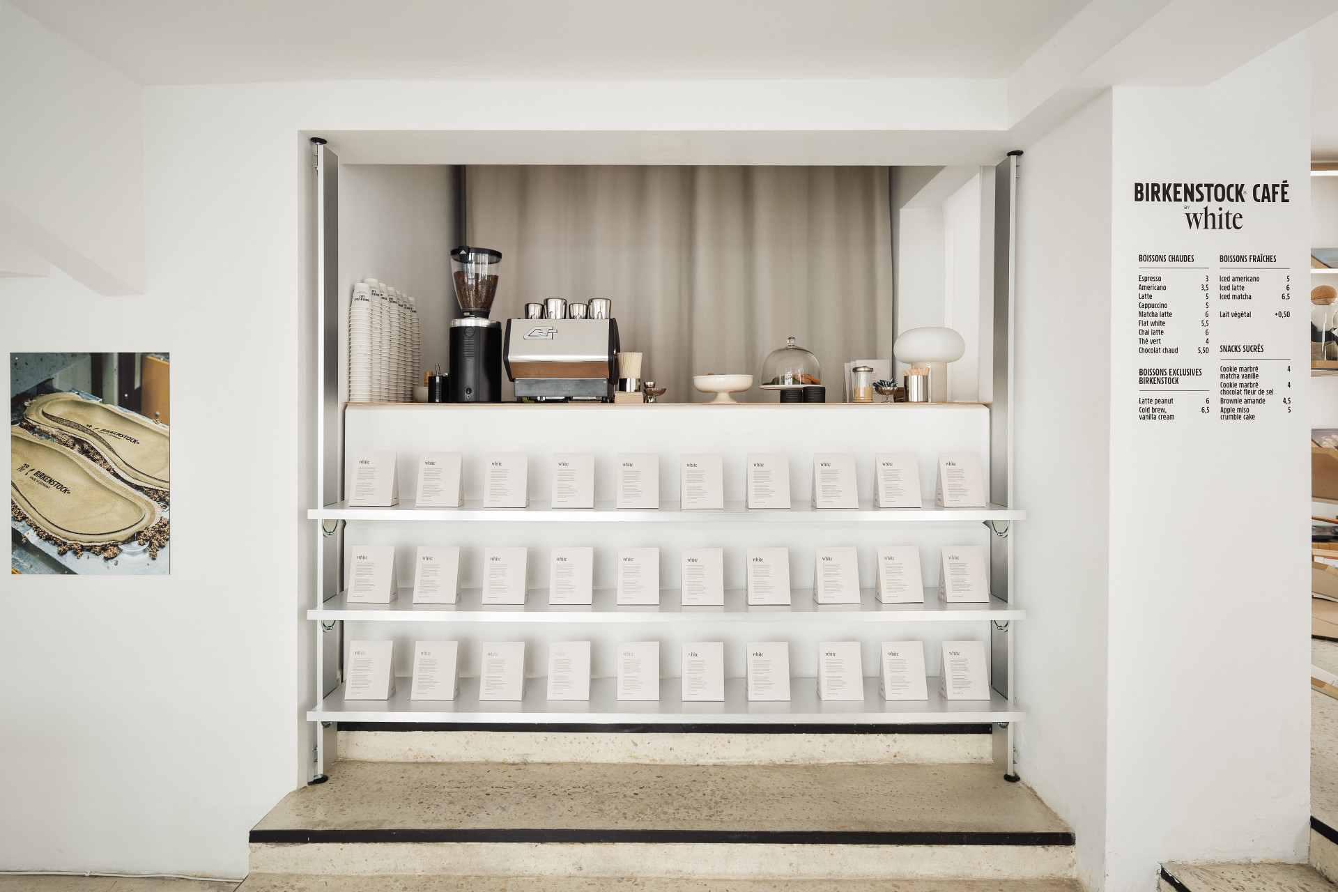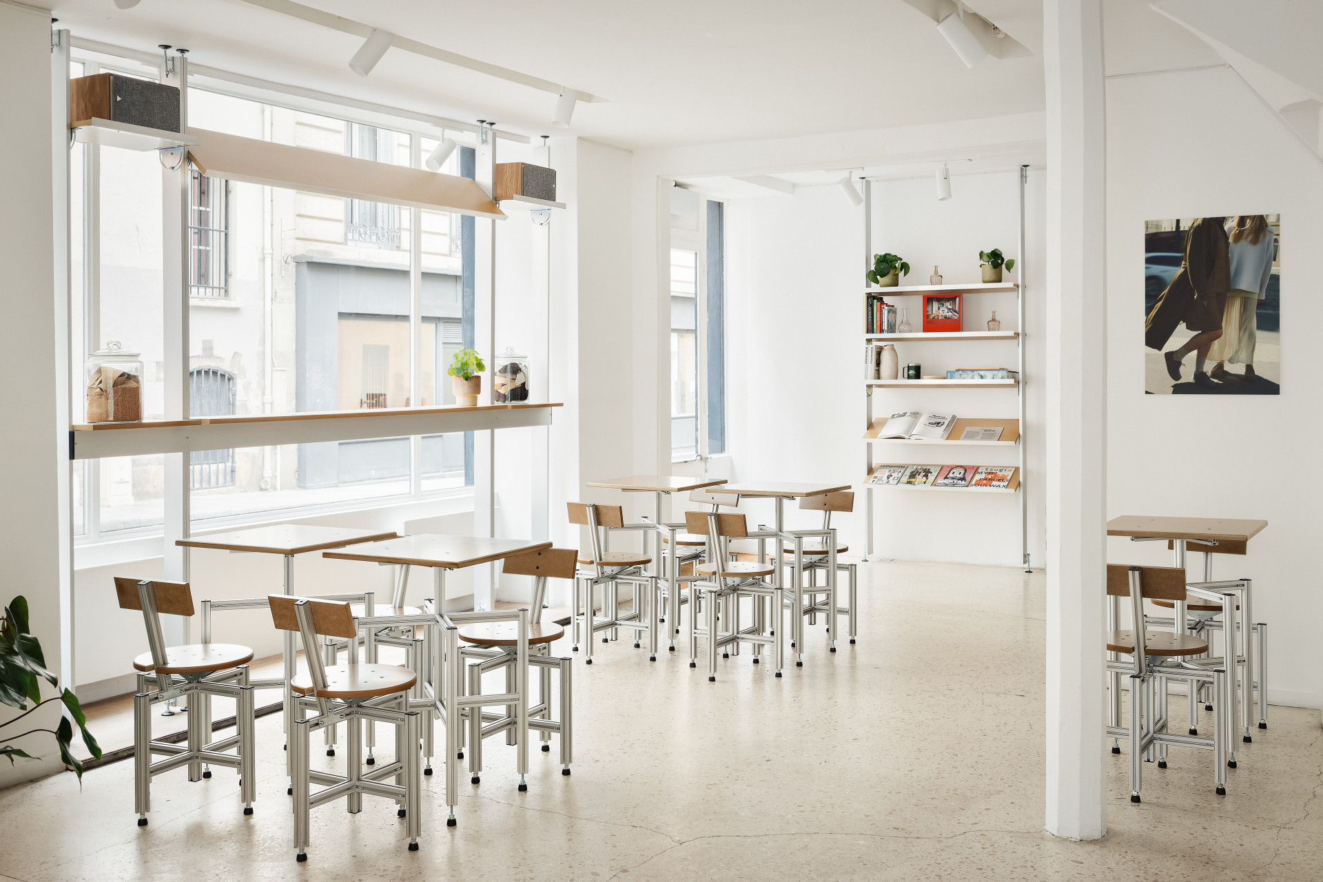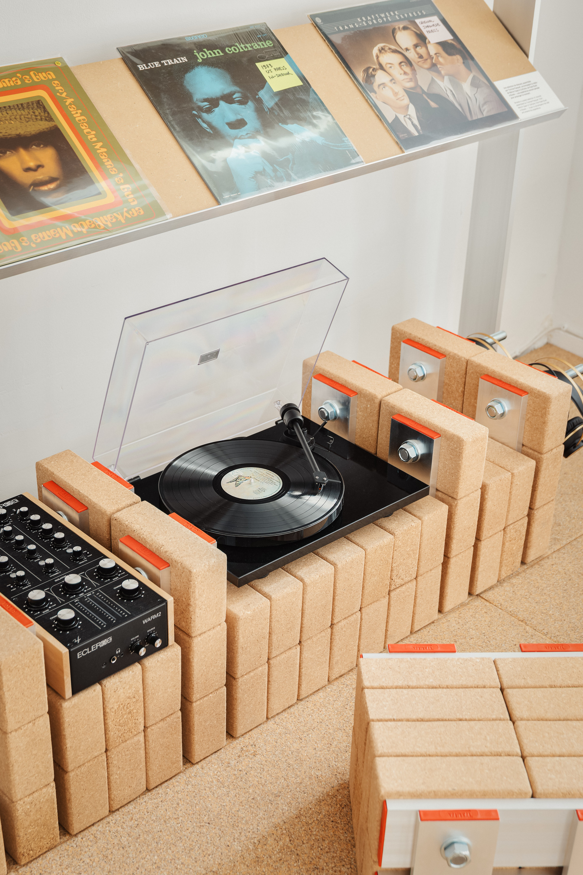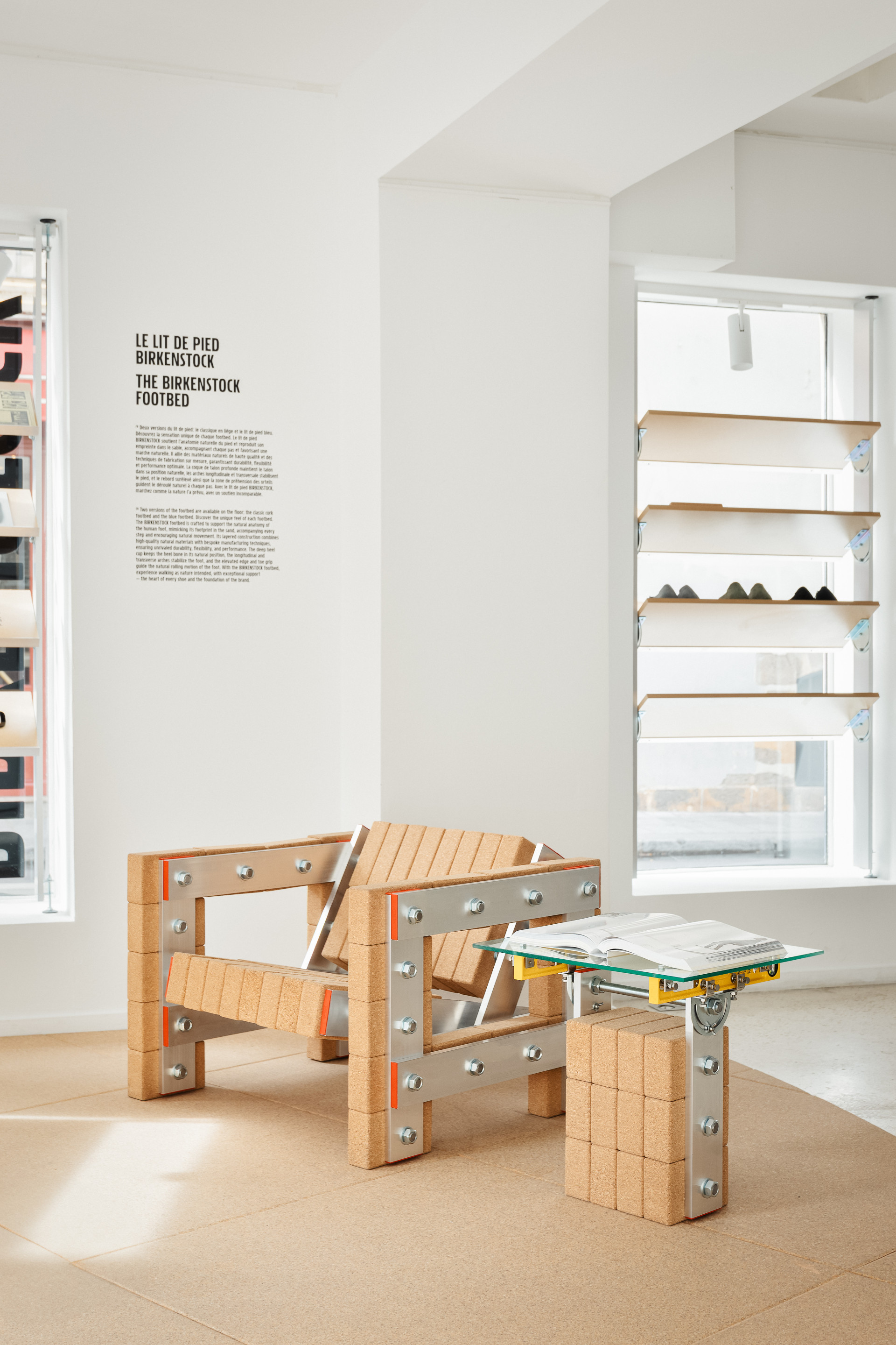 Le savoir-faire du liège (matière de prédilection de Birkenstock) a été exploré dans une collection de tables, fauteuils et tabourets conçus sur mesure pour cet espace. Soucieux de la provenance et du cycle de vie des matériaux utilisés, CRAFT choisit des matériaux recyclables indéfiniment comme le liège et l’aluminium.